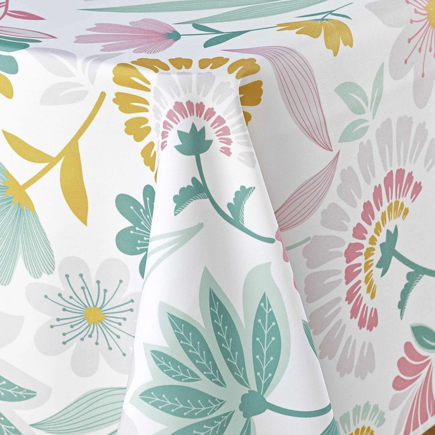 La fraîcheur des fleurs s’invite autour de la table avec cette belle nappe colorée, au traitement anti-taches.