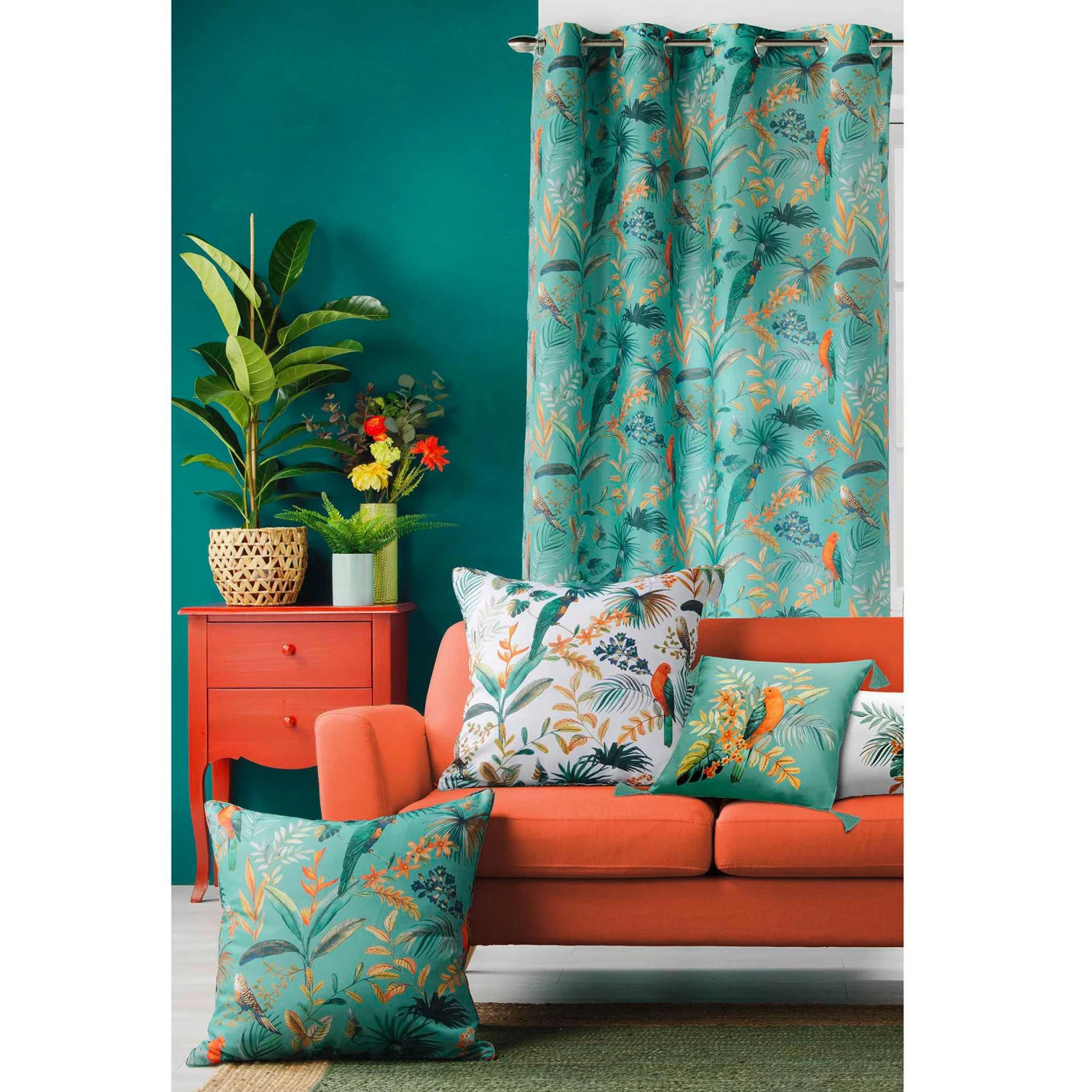 Imprimé : rideau à motif feuillage exotique.