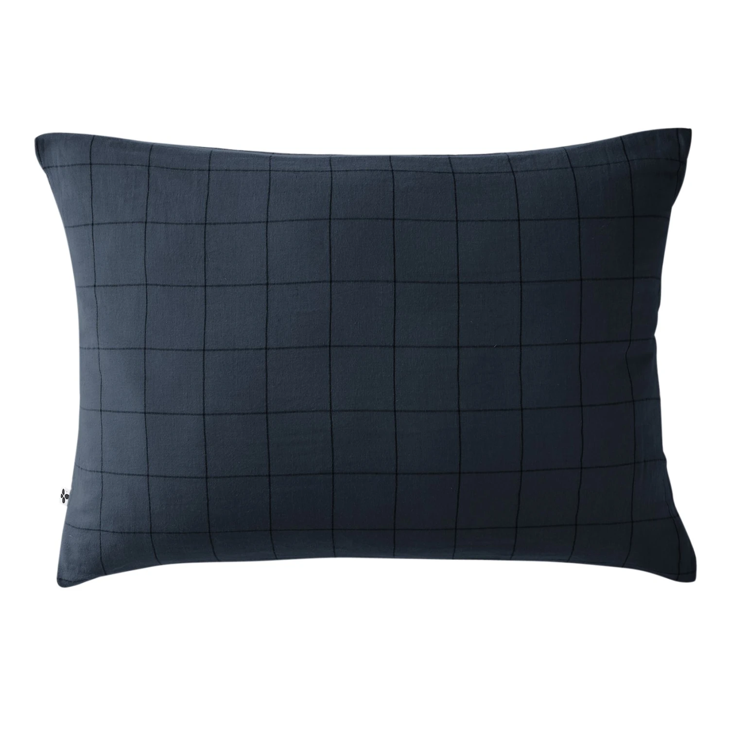 Une taie d’oreiller qui allie parfaitement la douceur de la gaze de coton avec le style intemporel et sophistiqué des grands carreaux.
