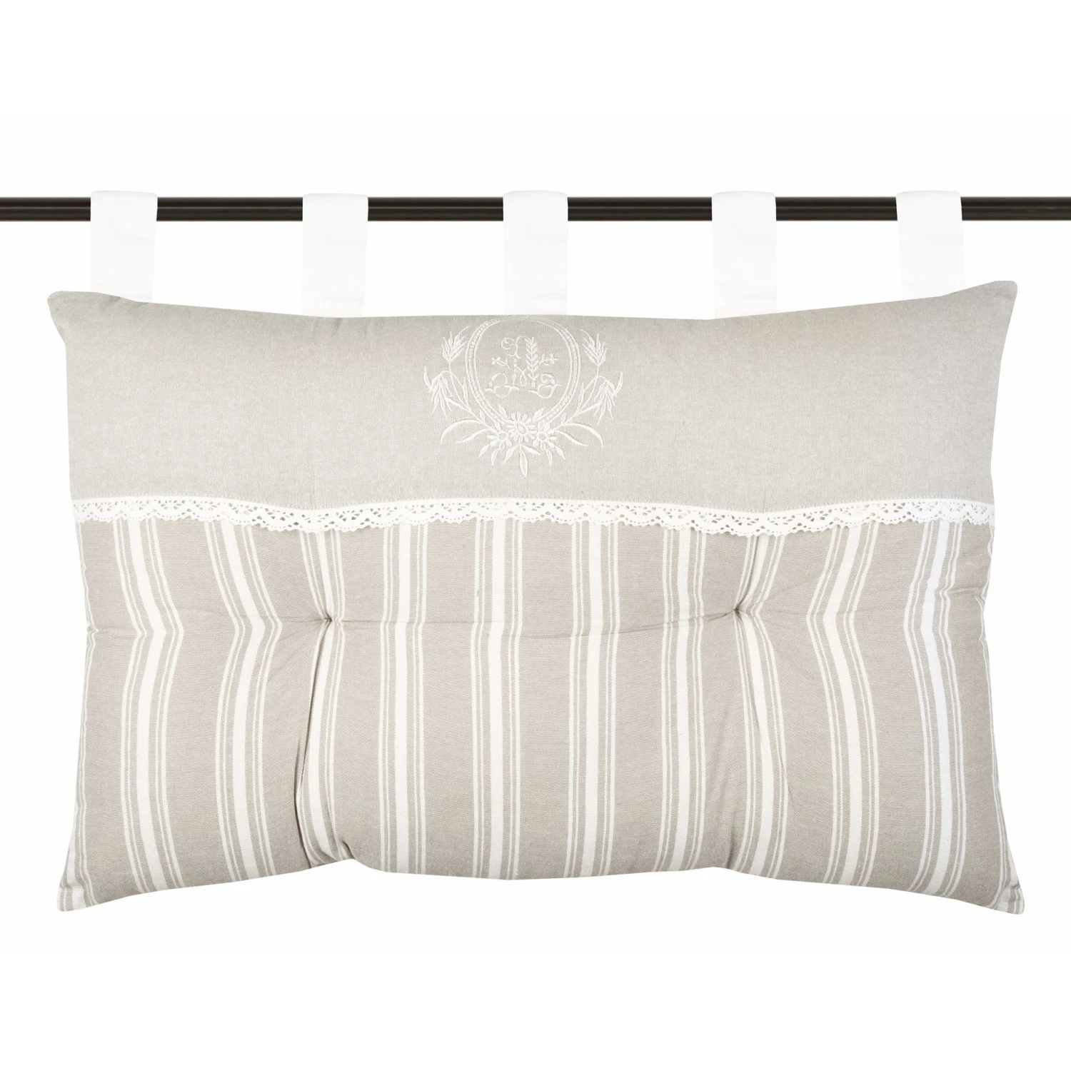 Imprimé : tête de lit à rayures et à broderie et dentelles.