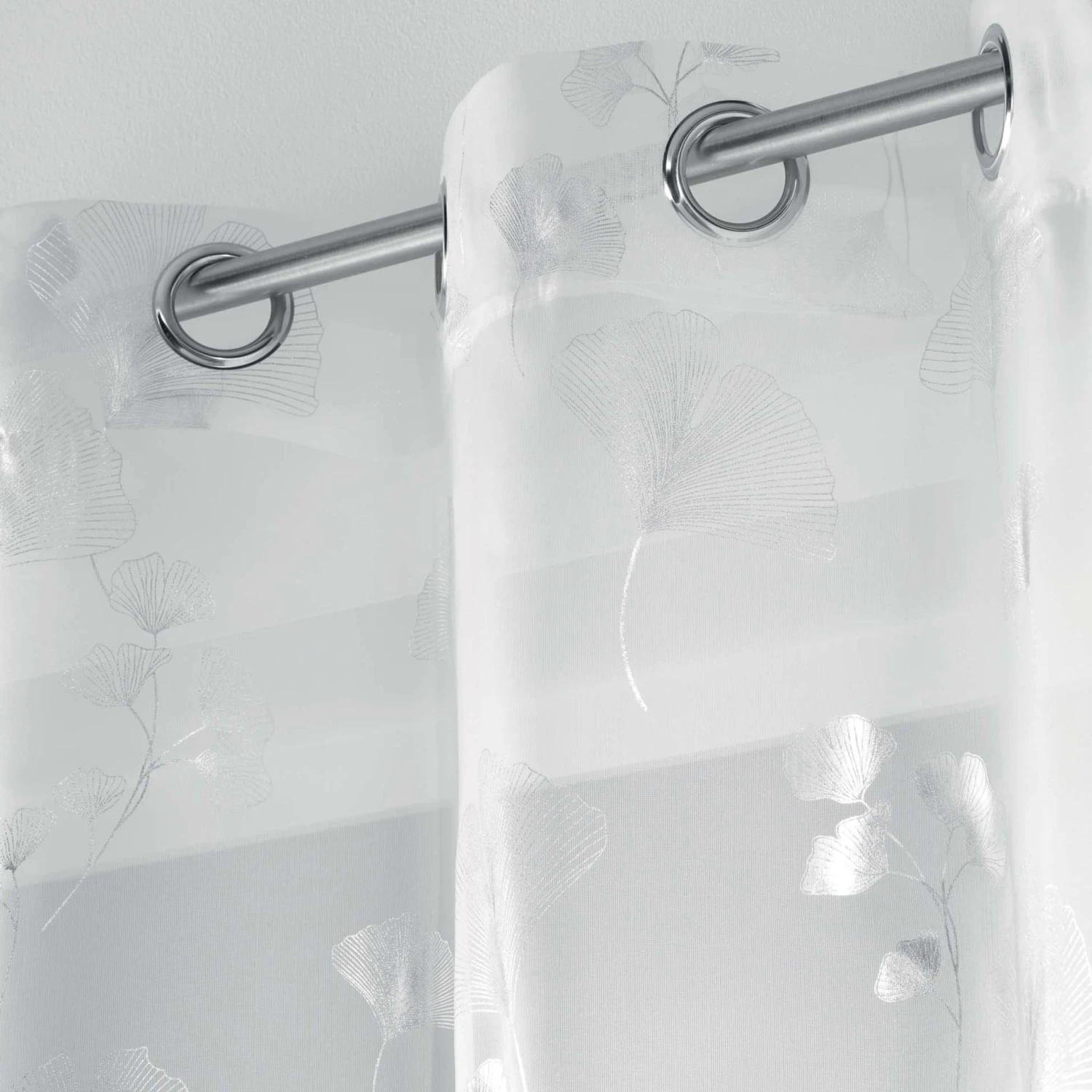 On adore ce voilage à reflets brillants argentés et à motif floral.