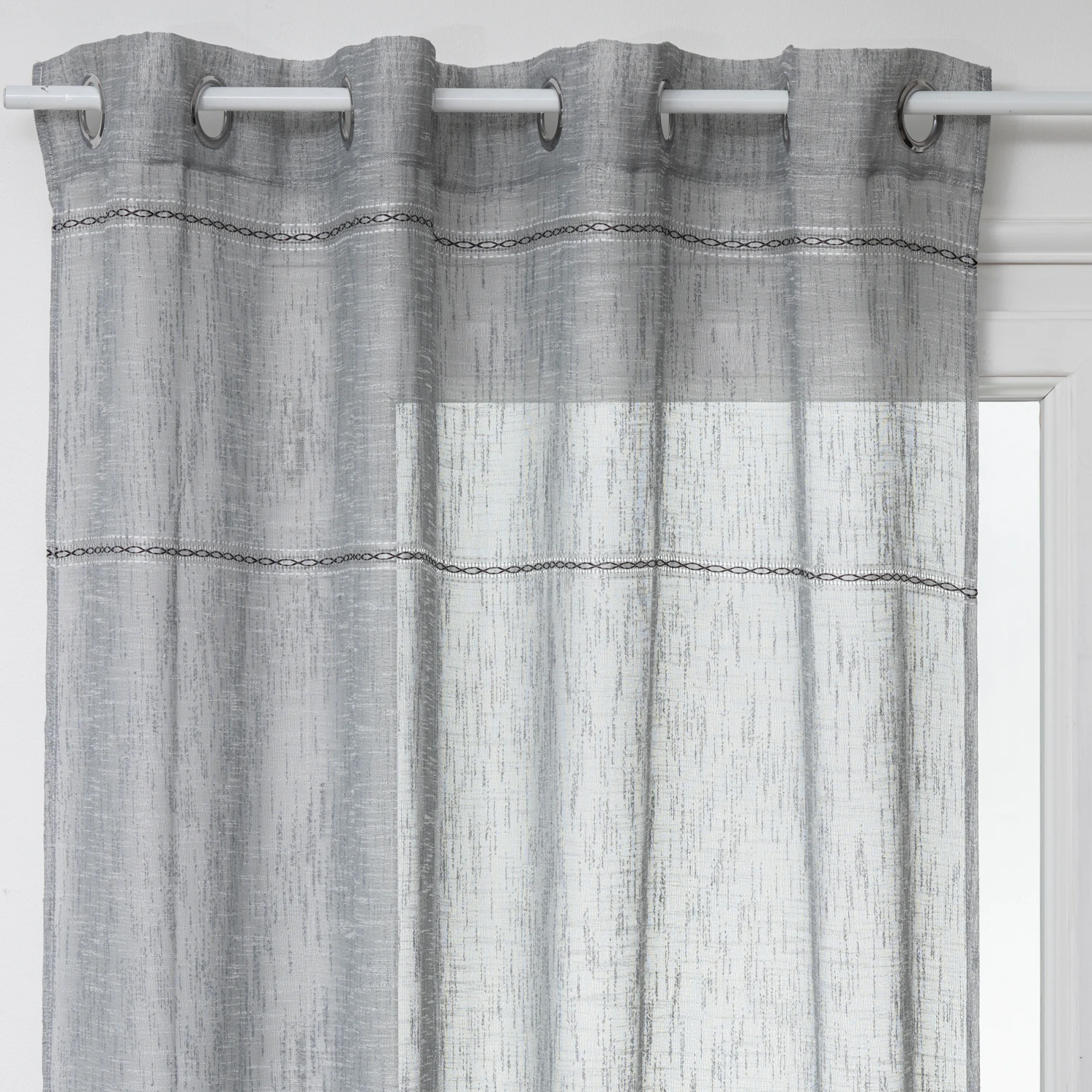 Un rideau relevé de jolis liserés à motif ethnique, pour habiller avec douceur vos fenêtres.