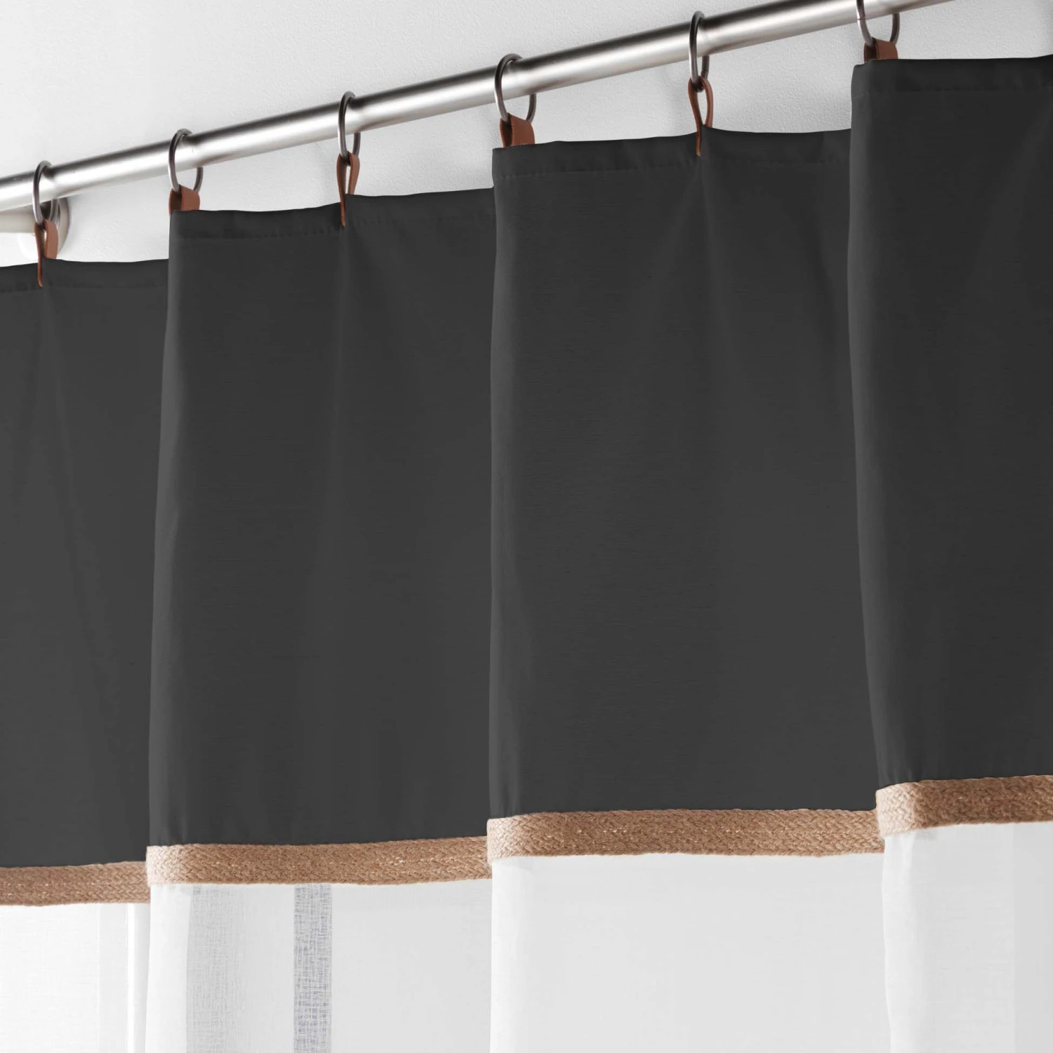 On adore ce voilage bicolore, rehaussé d’une bande de jute, pour un décor très naturel.